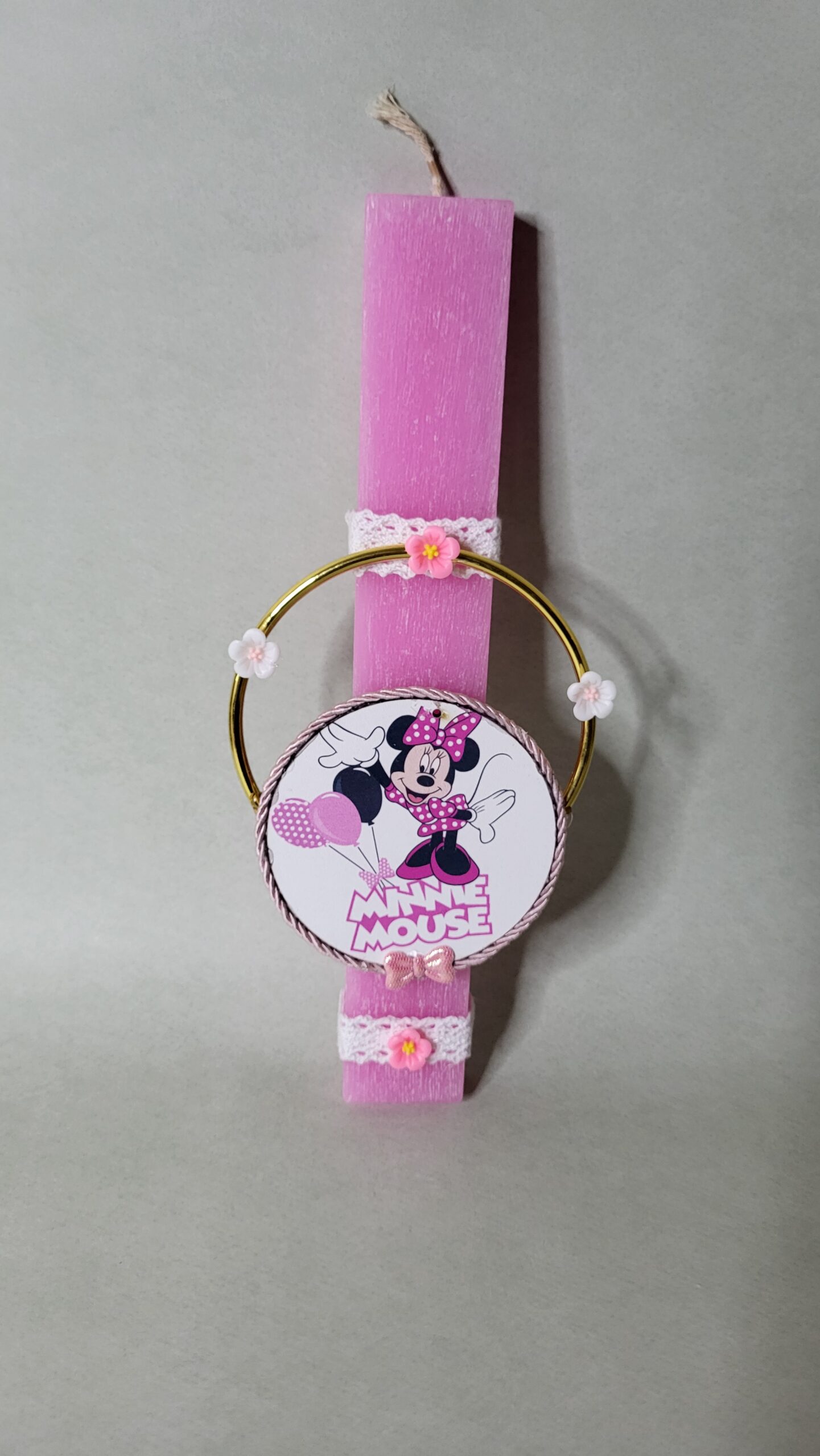 Η λαμπάδα κοσμείται από έναν εντυπωσιακό χρυσό μεταλλικό κρίκο, που δίνει μια αίσθηση πολυτέλειας και λάμψης. Στο κέντρο του κρίκου δεσπόζει η αγαπημένη φιγούρα της Minnie Mouse, κατασκευασμένη από ξύλο υψηλής ποιότητας με λεπτομερή κοπή laser. Το διακοσμητικό στοιχείο με τον κρίκο είναι αποσπώμενο. Μετά την Ανάσταση, μπορεί να χρησιμοποιηθεί ως ένα υπέροχο κρεμαστό διακοσμητικό για τον τοίχο ή την πόρτα του παιδικού δωματίου.