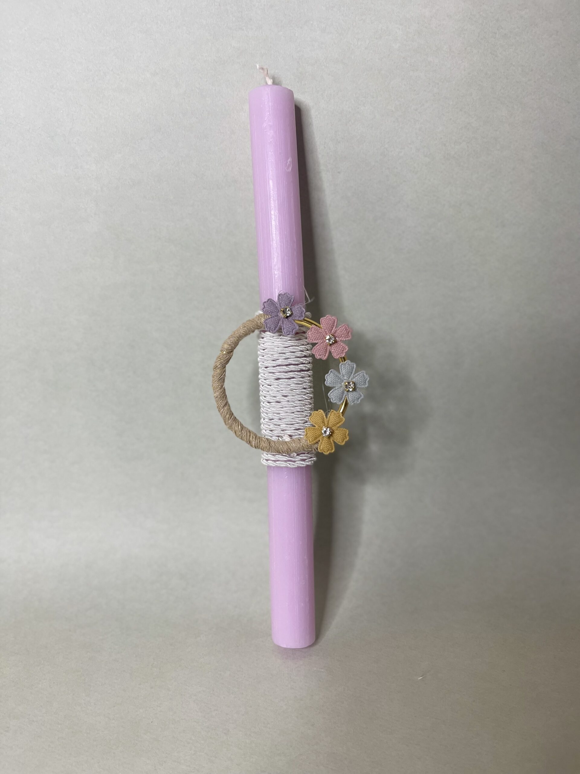 Το κερί είναι σε γλυκιά ροζ απόχρωση και είναι στολισμένο με ένα κομψό μεταλλικό κρίκο με λουλούδια σε παστέλ αποχρώσεις όπως το σάπιο μήλο και το μοβ. Στην καρδιά κάθε λουλουδιού, ένα αστραφτερό στρας αντανακλά το φως της Ανάστασης, προσθέτοντας μια νότα πολυτέλειας.