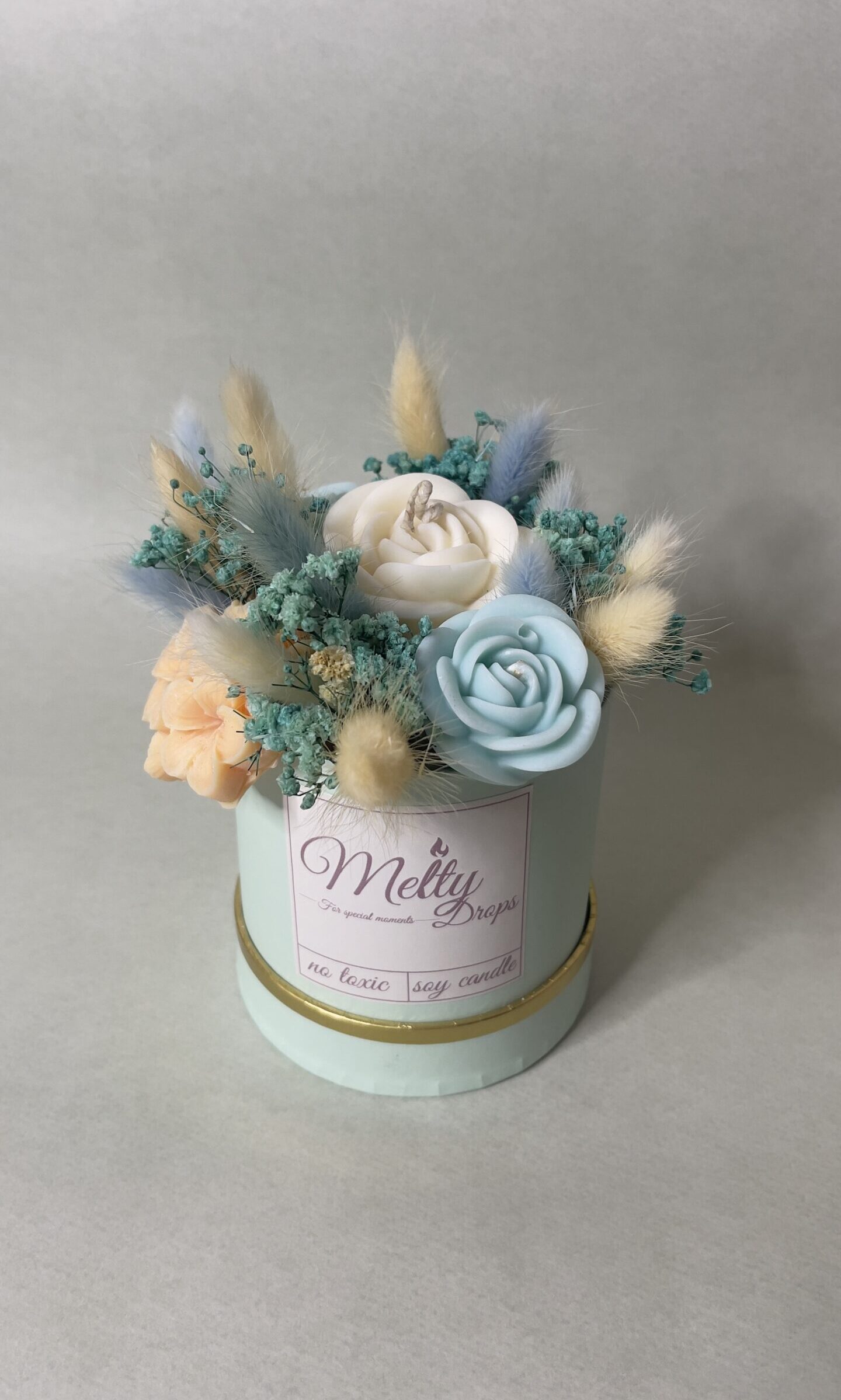 Χειροποίητο αρωματικό μπουκέτο σε μικρή γαλάζια καπελιέρα από 100% φυτικό κερί με άρωμα bohemia & cotton.